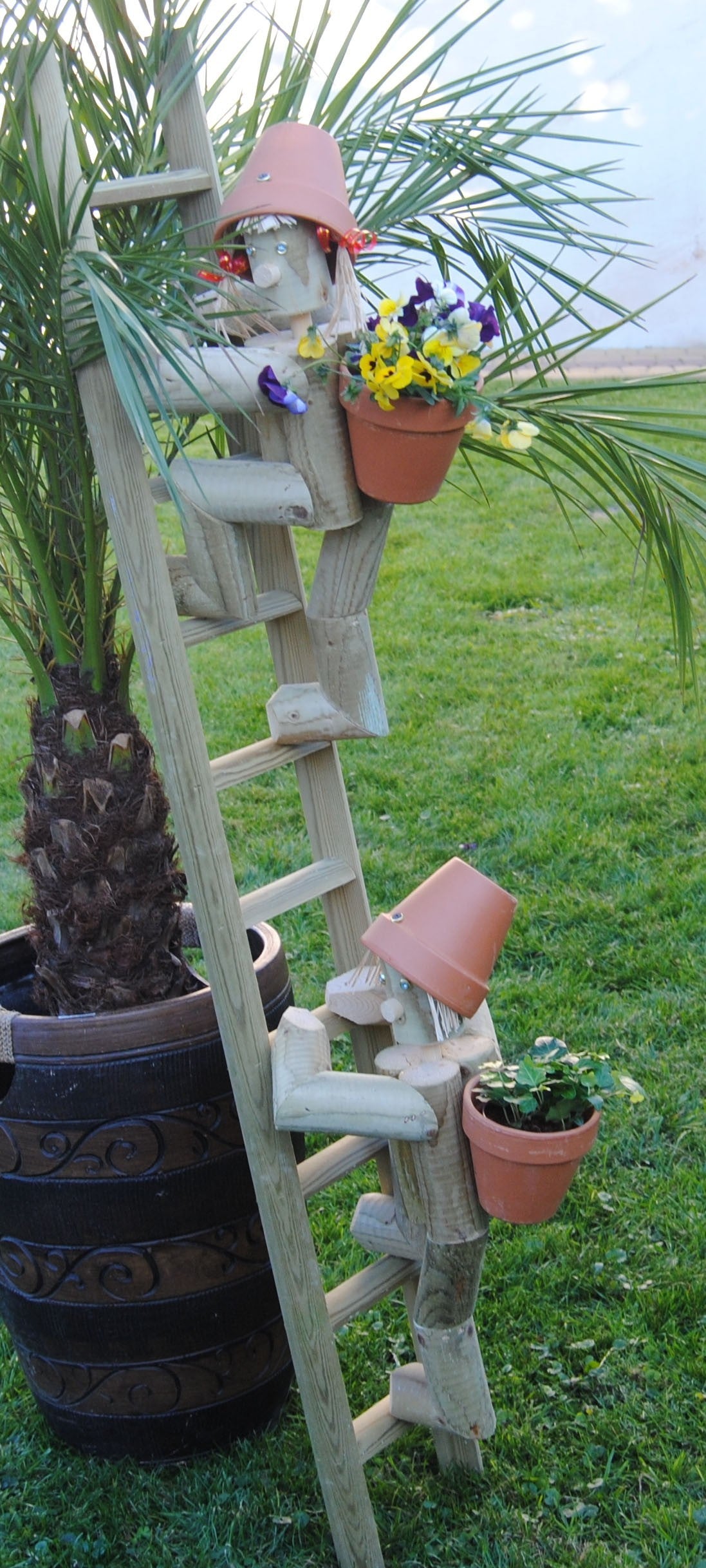 A girl and a boy climbing a ladder that you can place anywhere in the garden, e.g. leaning against a tree or hanging on a fence. The couple have pots on their backs with flowers in them.