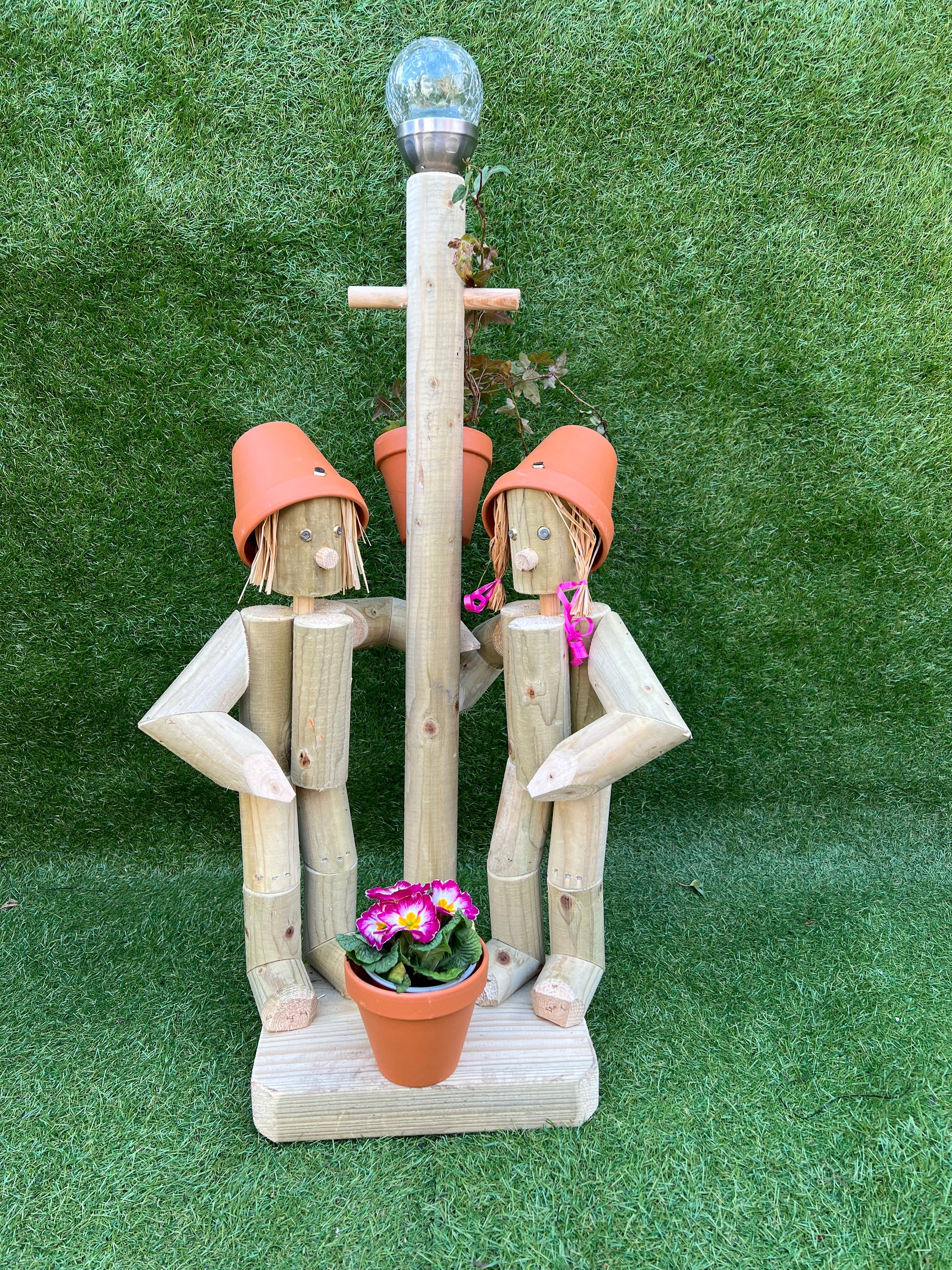 Boy & Girl standing on a wooden plinth with a lamp post .solar Light charges all day long and gives you nice Light at night!