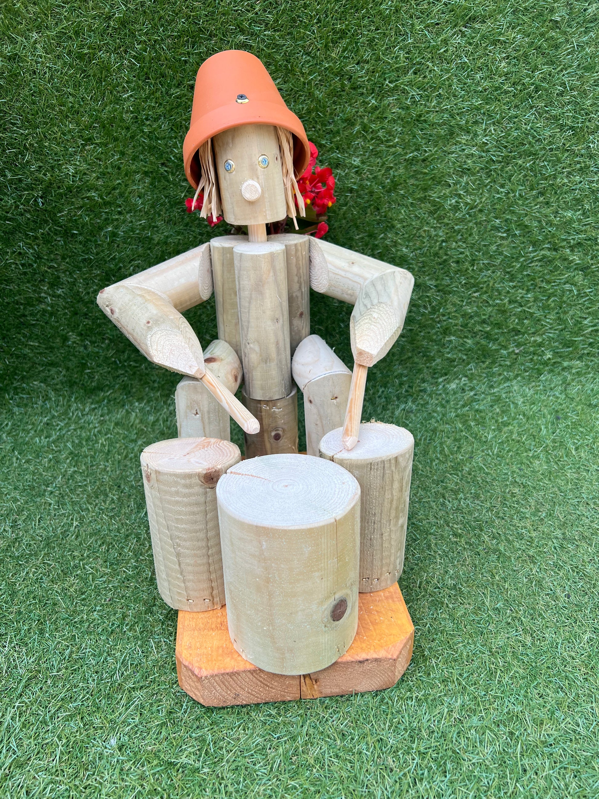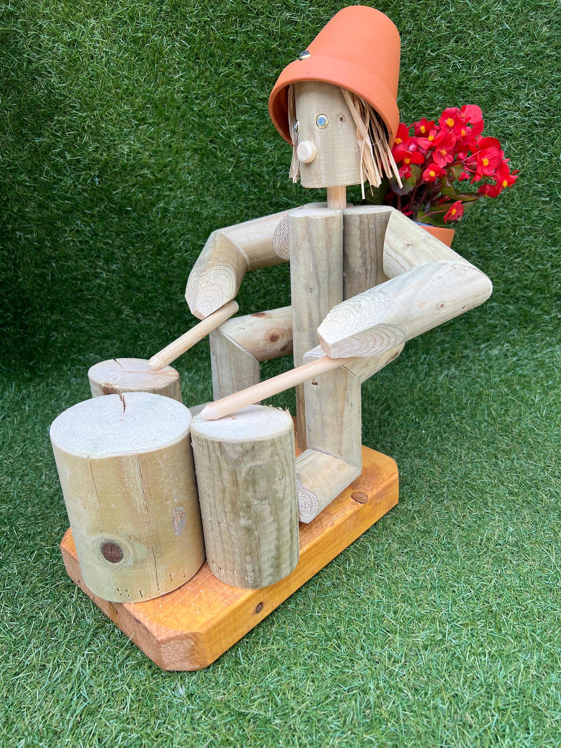 A wooden man sitting and playing the drums, with a flower pot on the bac.