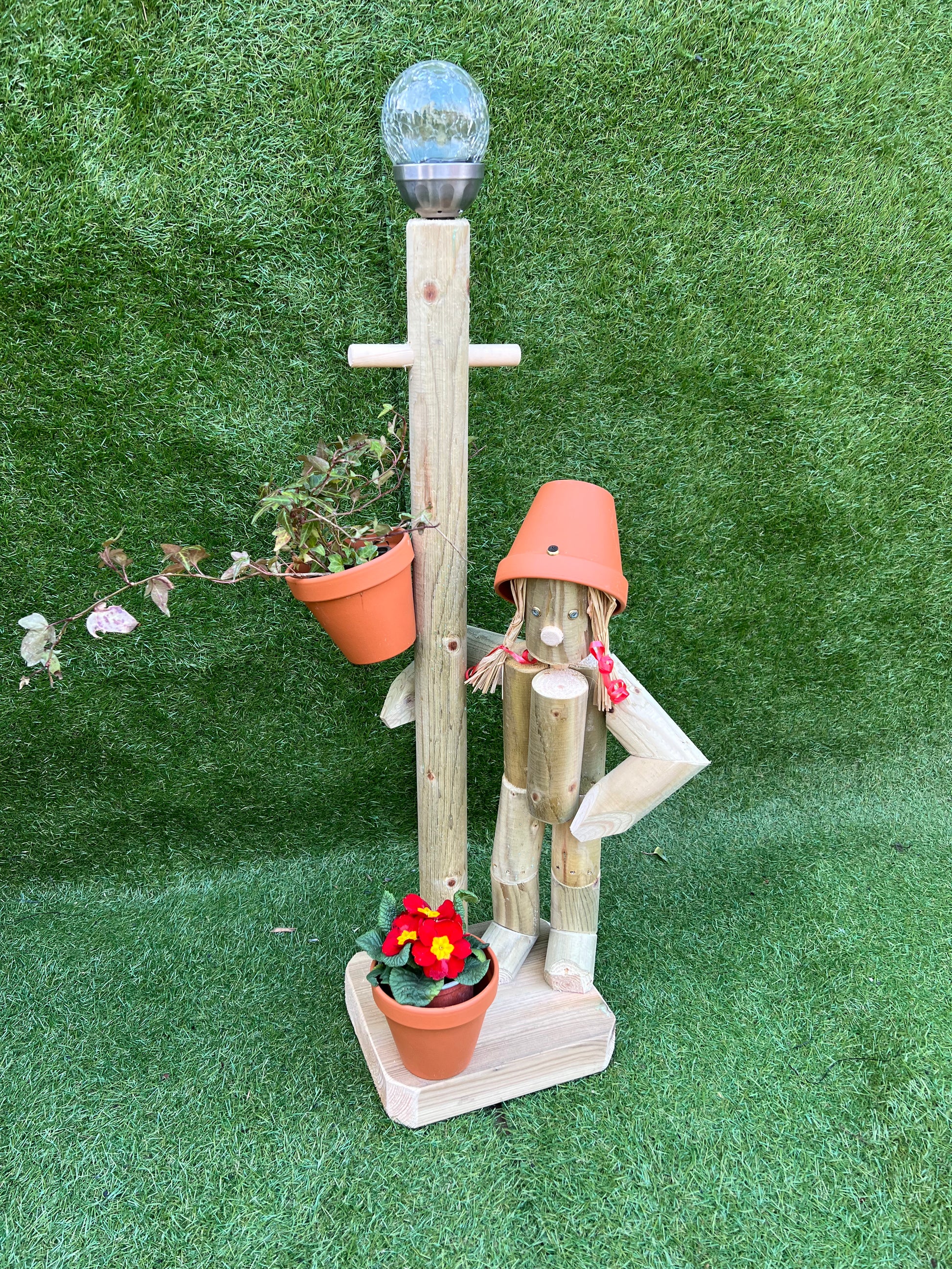Girl standing on a wooden plinth with a lamp-stand and solar light.Solar Light charges all day and gives you nice Light at night!
