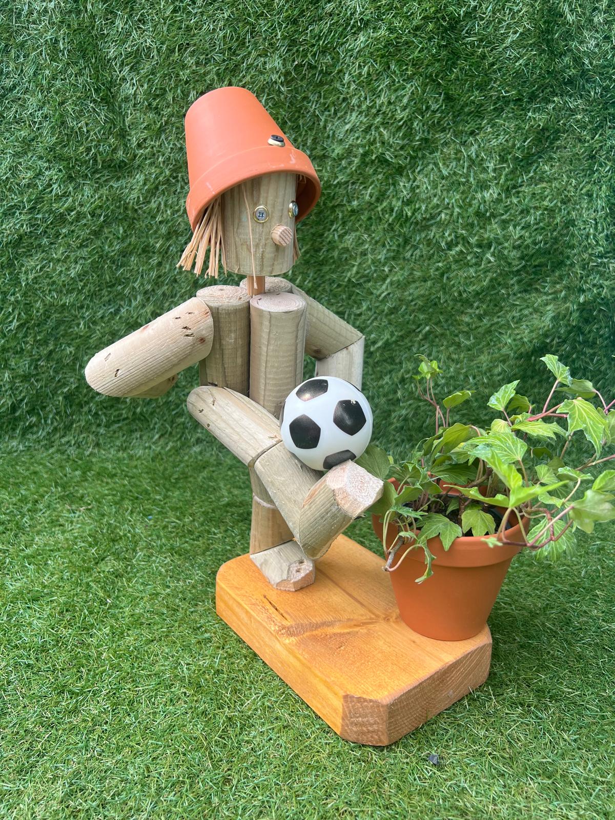 Bring charm and character to your garden with this delightful handmade figurine of a little boy or girl kicking a ball, complete with decorative flower pots in front. Perfect as a unique gift or a cheerful addition to your outdoor space.