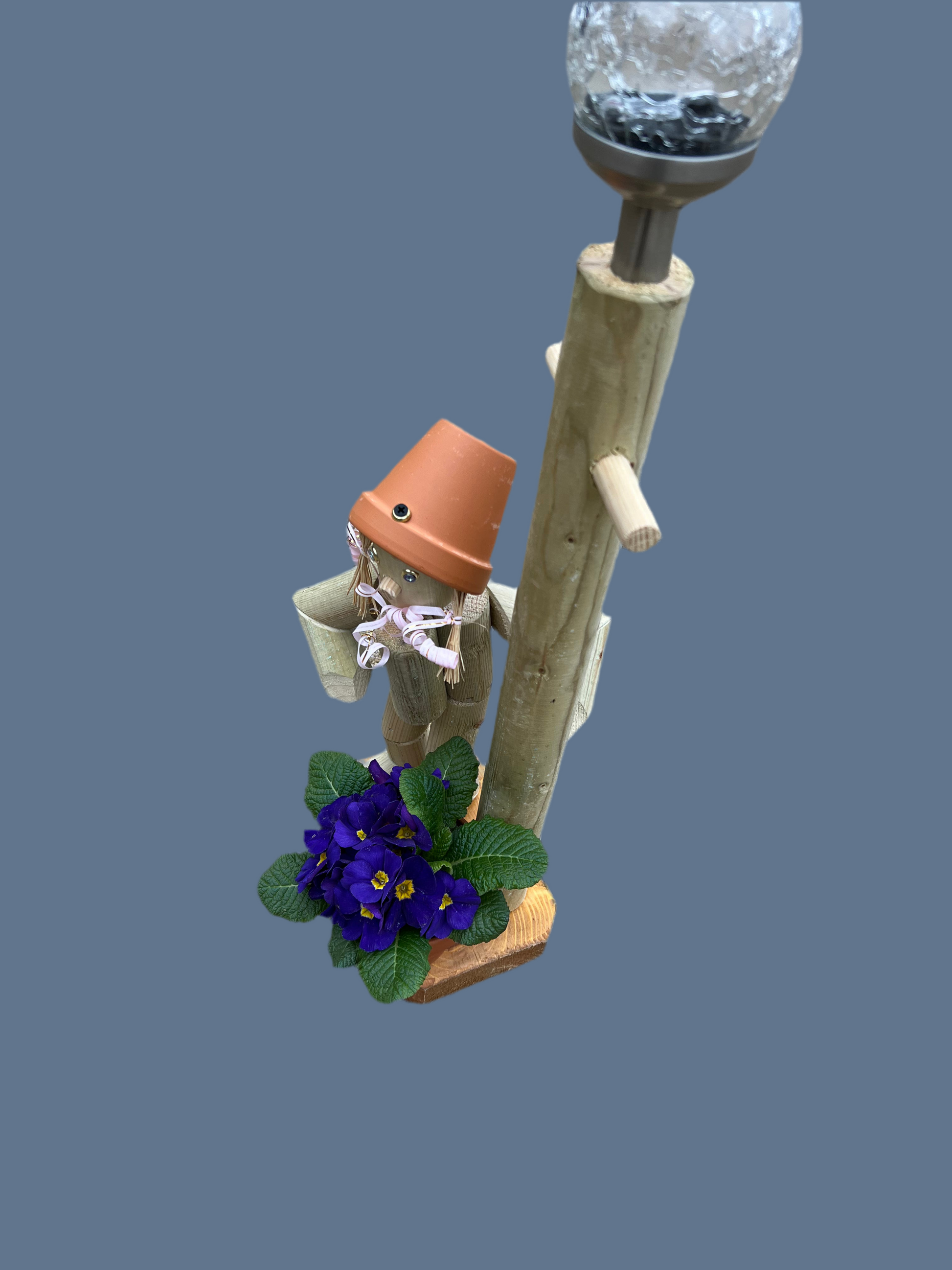 A charming figurine of a little girl or boy standing on a wooden plinth with a lamp-stand and solar light. The light charges during the day and automatically turns on at night, creating a warm and welcoming glow in your garden or patio.
