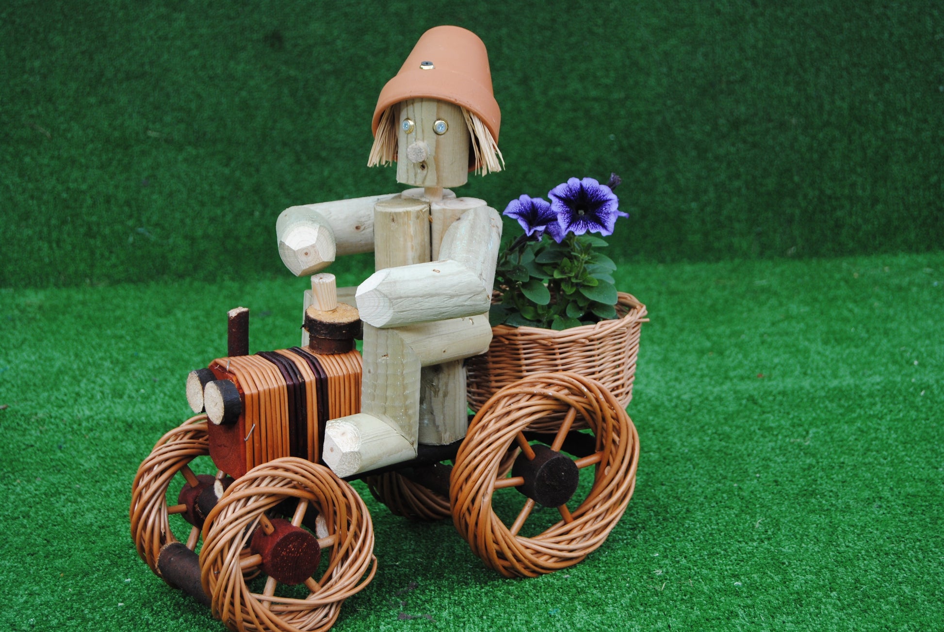 A boy driving a small wicker tractor.