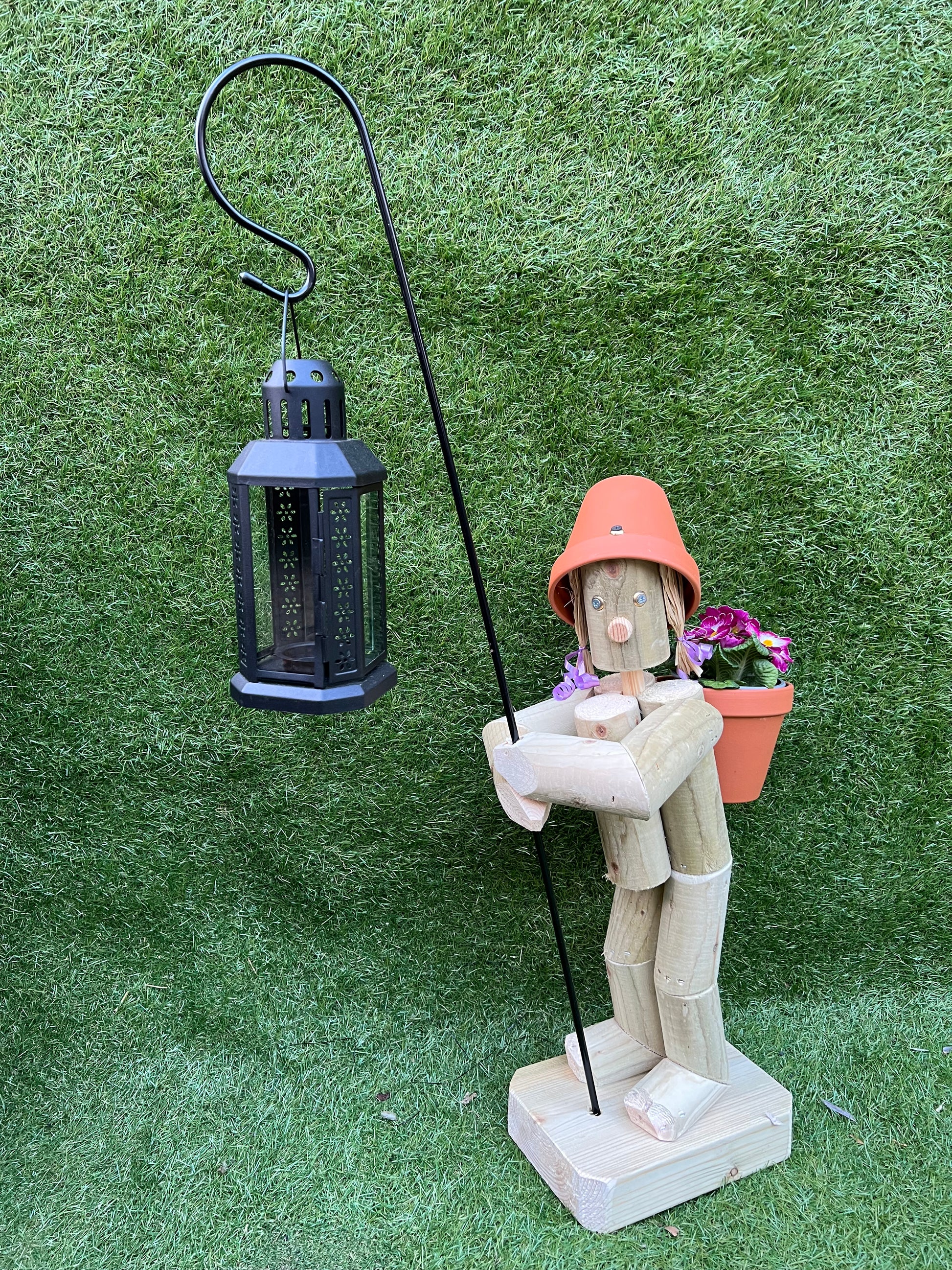A girl or Boy standing on a wooden plinth holding a metal hanger with lanterns in her hands.