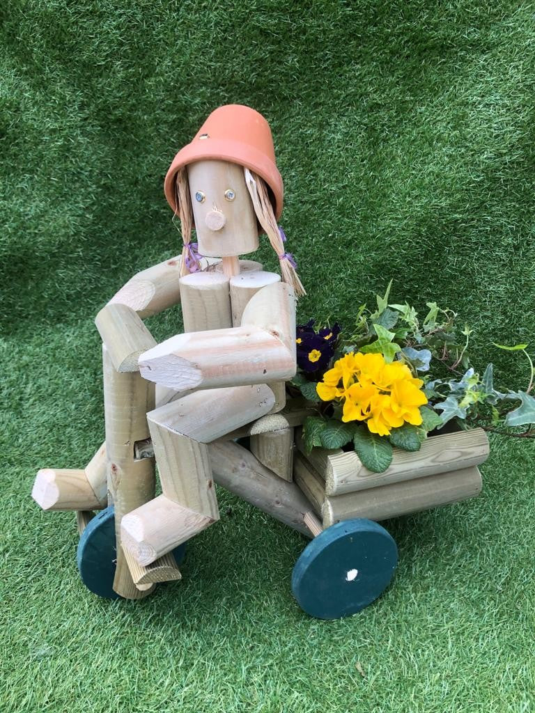 Girl cyclist riding a tricycle with a plant carrier at the back.